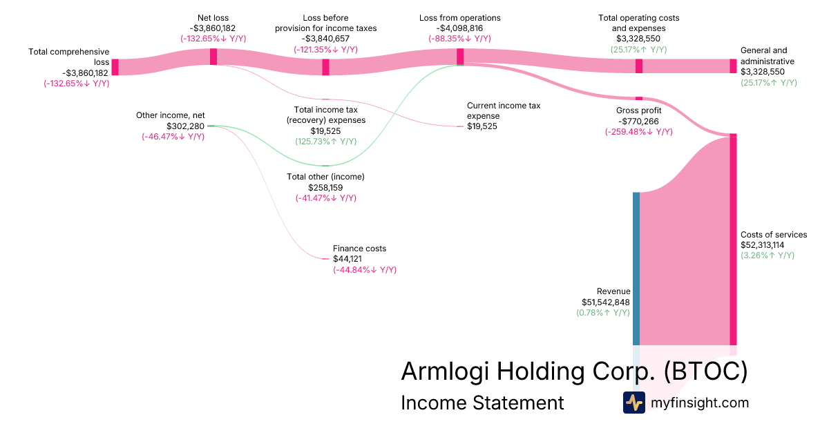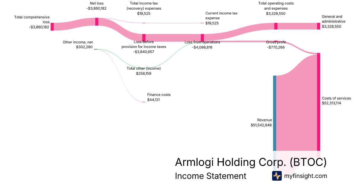 For the quarter ending 2025-12-31, BTOC made $51,542,848 in revenue. -$3,860,182 in net income. Net profit margin of -7.49%.