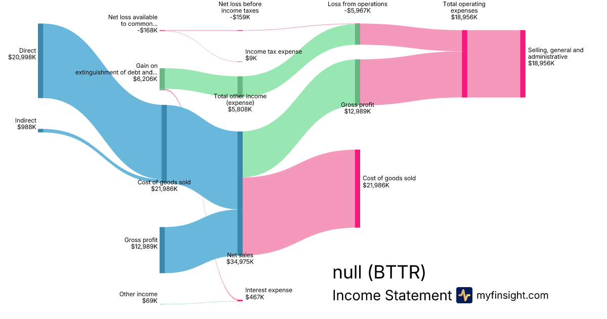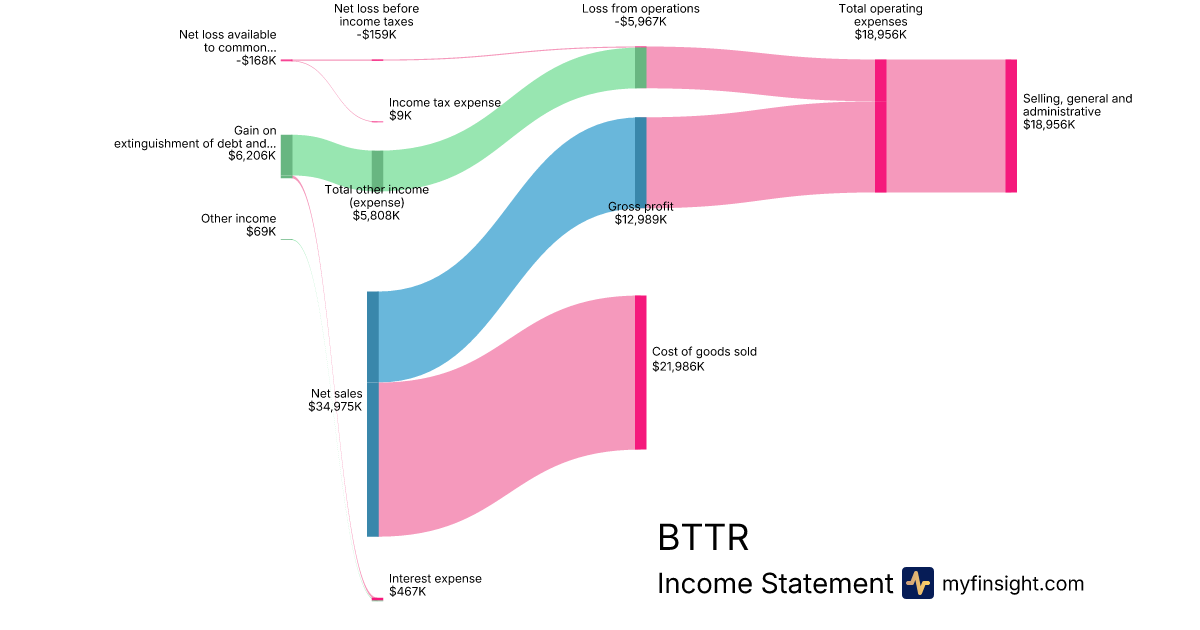 For the year ending 2024-12-31, BTTR made $34,975K in revenue. -$168K in net income. Net profit margin of -0.48%.