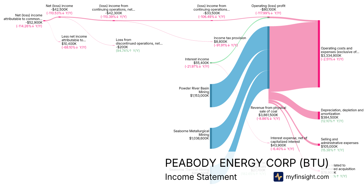 For the year ending 2025-12-31, BTU made $3,861,500K in revenue. -$52,900K in net income. Net profit margin of -1.37%.