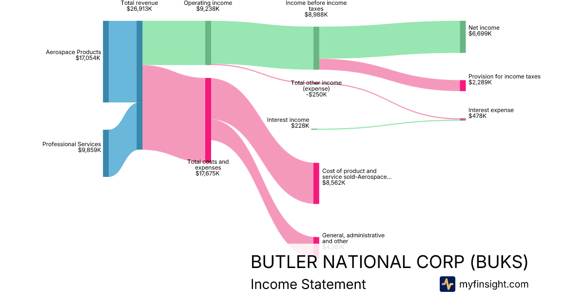For the quarter ending 2026-01-31, BUKS made $26,913K in revenue. $6,699K in net income. Net profit margin of 24.89%.