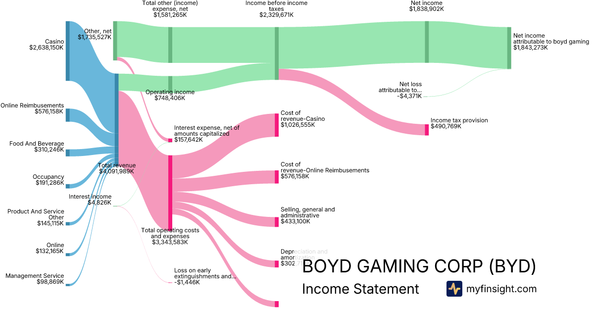 For the year ending 2025-12-31, BYD made $4,091,989K in revenue. $1,843,273K in net income. Net profit margin of 45.05%.