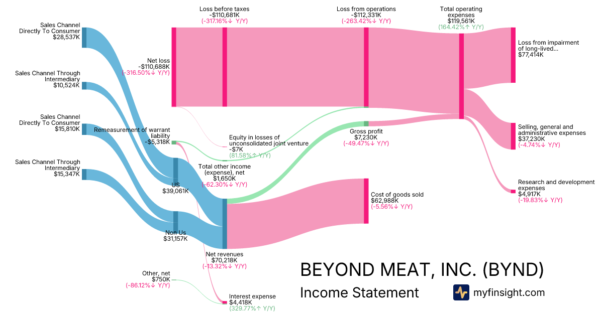 For the quarter ending 2025-09-27, BYND made $70,218K in revenue. -$110,688K in net income. Net profit margin of -157.63%.