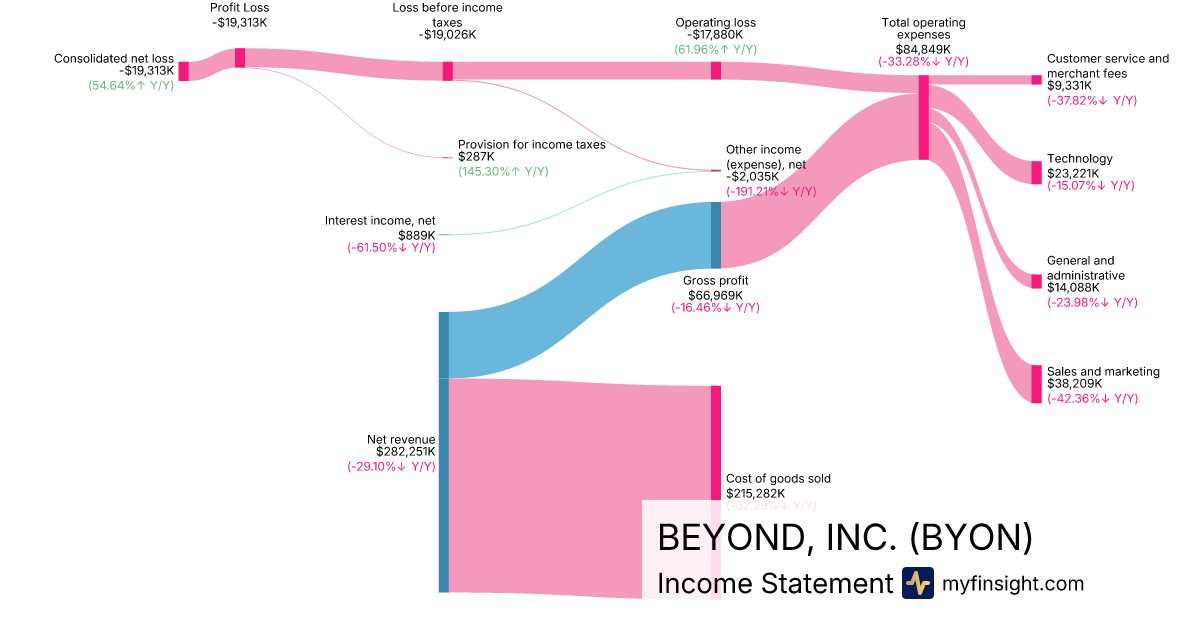 For the quarter ending 2025-06-30, BYON made $282,251K in revenue. -$19,313K in net income. Net profit margin of -6.84%.