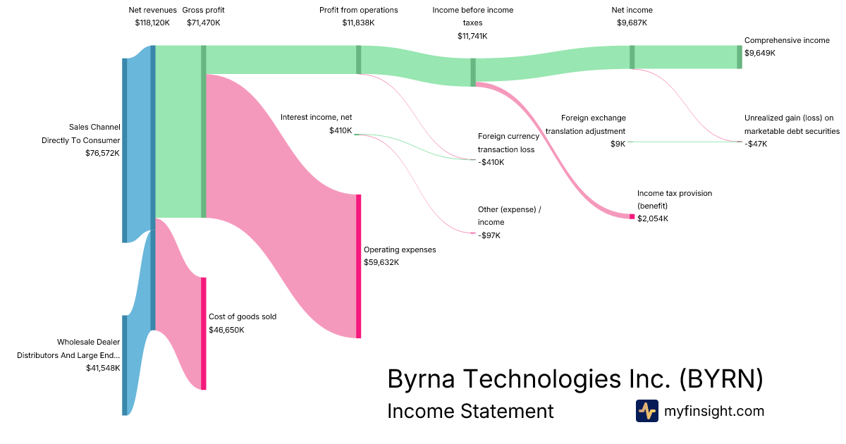 For the year ending 2025-11-30, BYRN made $118,120K in revenue. $9,649K in net income. Net profit margin of 8.17%.