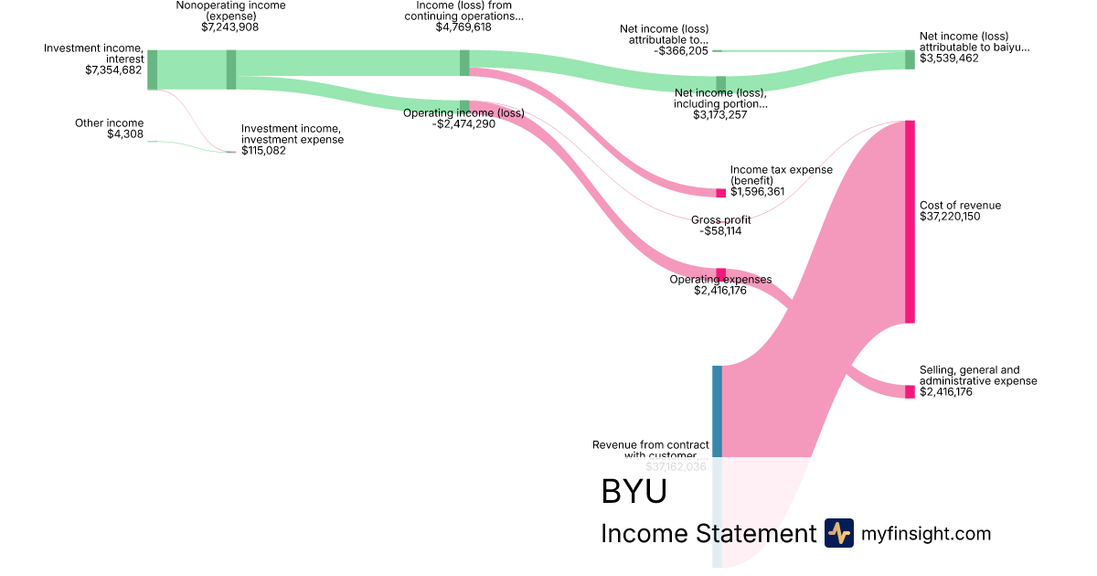 For the quarter ending 2024-09-30, BYU made $37,162,036 in revenue. $3,539,462 in net income. Net profit margin of 9.52%.