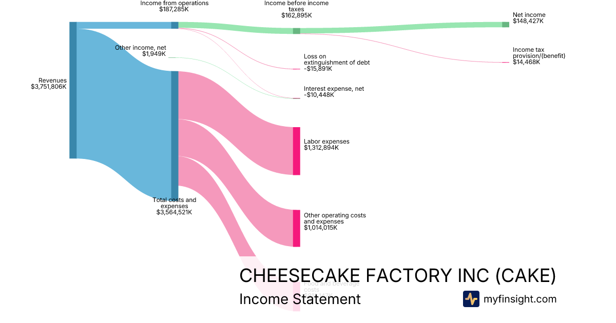 For the year ending 2025-12-30, CAKE made $3,751,806K in revenue. $148,427K in net income. Net profit margin of 3.96%.