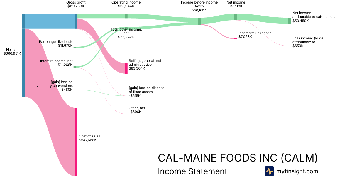 For the quarter ending 2026-02-28, CALM made $666,951K in revenue. $50,459K in net income. Net profit margin of 7.57%.