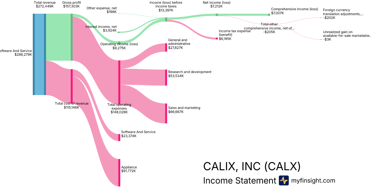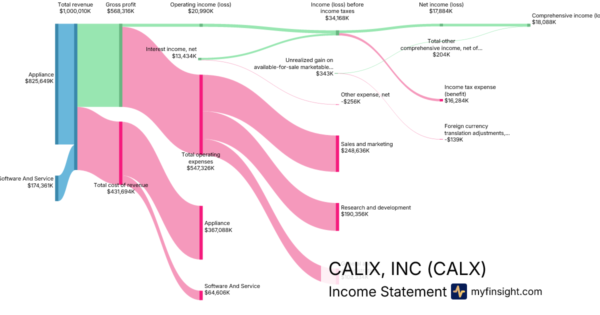 For the year ending 2025-12-31, CALX made $1,000,010K in revenue. $18,088K in net income. Net profit margin of 1.81%.