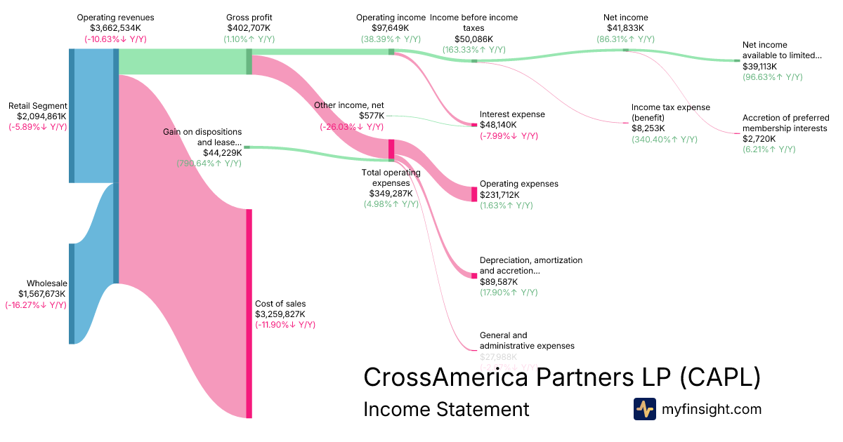 For the year ending 2025-12-31, CAPL made $3,662,534K in revenue. $39,113K in net income. Net profit margin of 1.07%.
