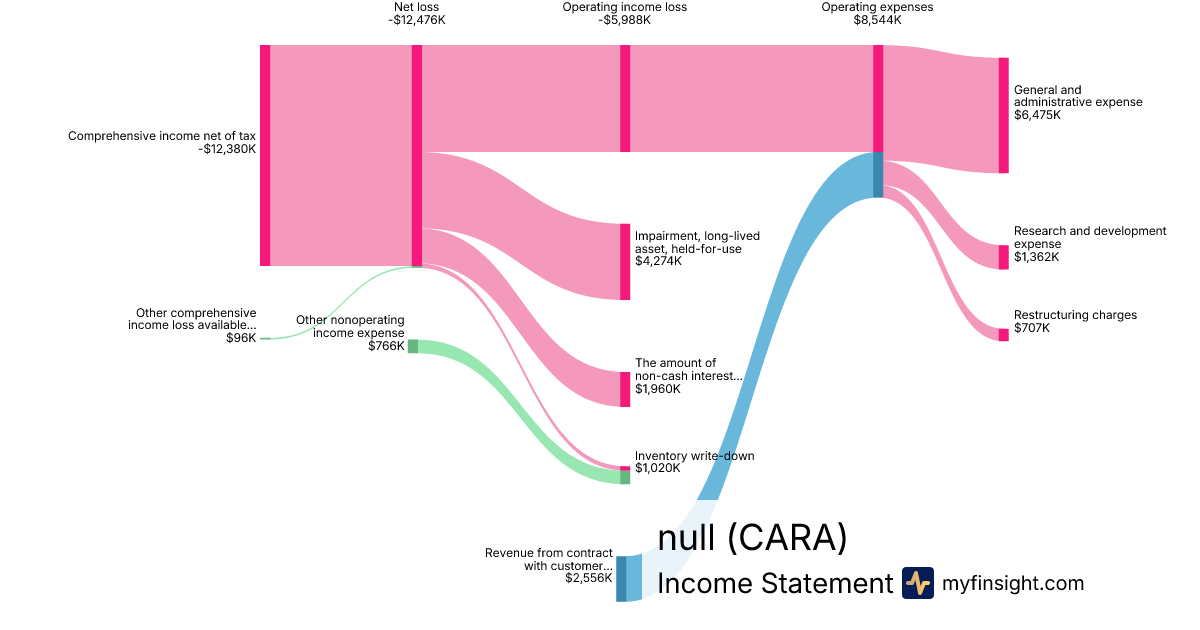 For the quarter ending 2024-09-30, CARA made $2,556K in revenue. -$12,380K in net income. Net profit margin of -484.35%.