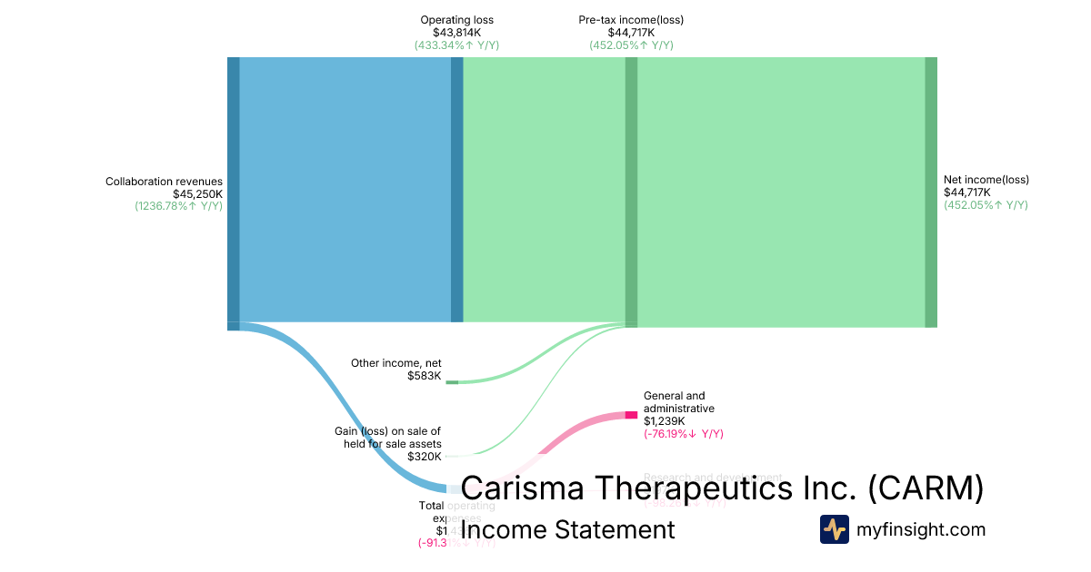 For the quarter ending 2025-09-30, CARM made $45,250K in revenue. $44,717K in net income. Net profit margin of 98.82%.