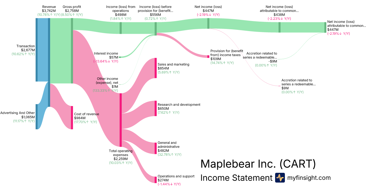 For the year ending 2025-12-31, CART made $3,742M in revenue. $447M in net income. Net profit margin of 11.95%.