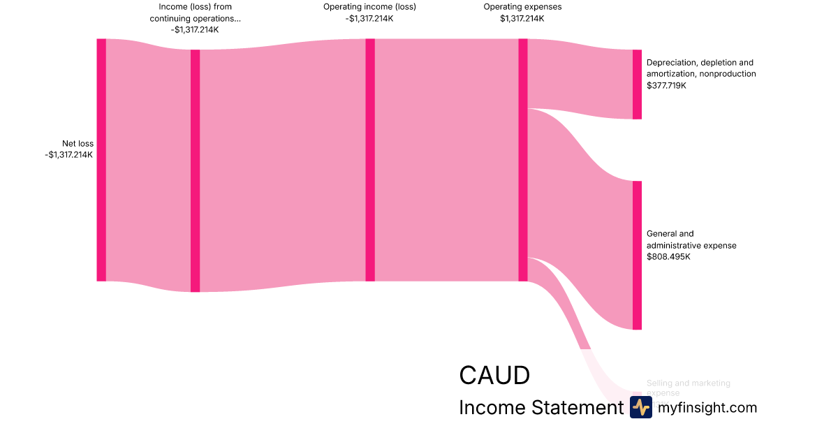 For the quarter ending 2024-06-30, CAUD made $1,317.214K in revenue. -$1,317.214K in net income. Net profit margin of -100.00%.