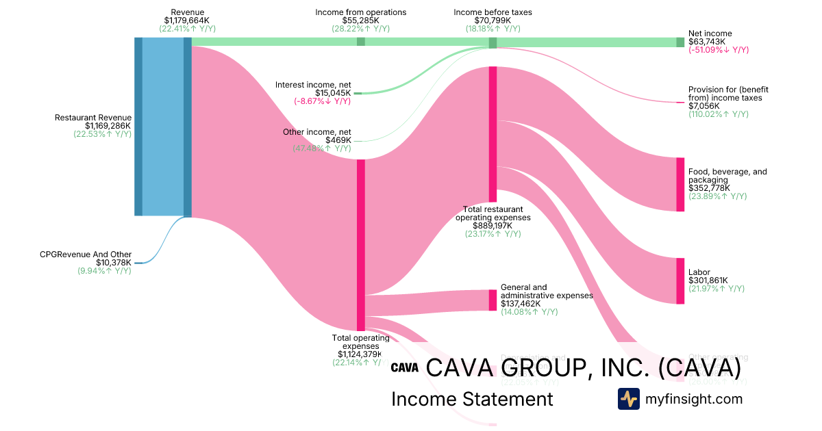 For the year ending 2025-12-28, CAVA made $1,179,664K in revenue. $63,743K in net income. Net profit margin of 5.40%.