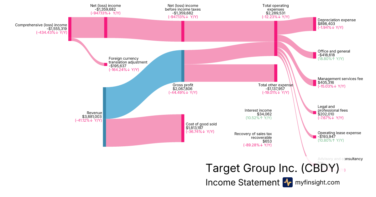 For the year ending 2025-12-31, CBDY made $3,881,003 in revenue. -$1,555,319 in net income. Net profit margin of -40.08%.