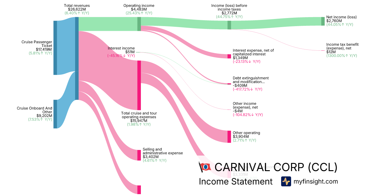 For the year ending 2025-11-30, CCL made $26,622M in revenue. $2,760M in net income. Net profit margin of 10.37%.
