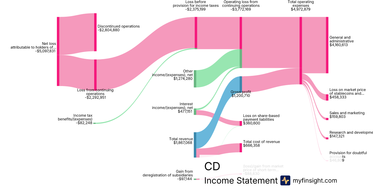 For the year ending 2025-12-31, CD made $1,867,068 in revenue. -$5,097,831 in net income. Net profit margin of -273.04%.