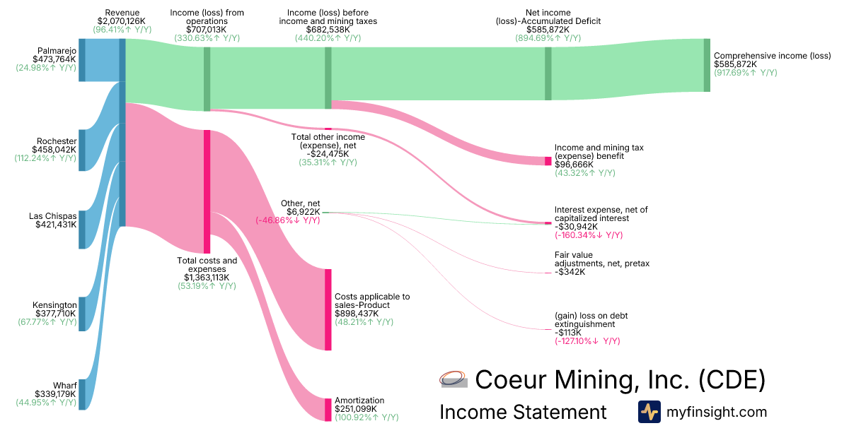 For the year ending 2025-12-31, CDE made $2,070,126K in revenue. $585,872K in net income. Net profit margin of 28.30%.