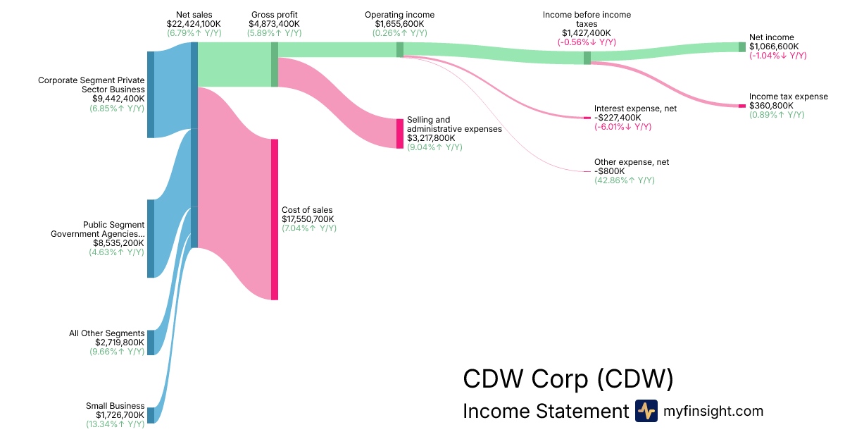 For the year ending 2025-12-31, CDW made $22,424,100K in revenue. $1,066,600K in net income. Net profit margin of 4.76%.