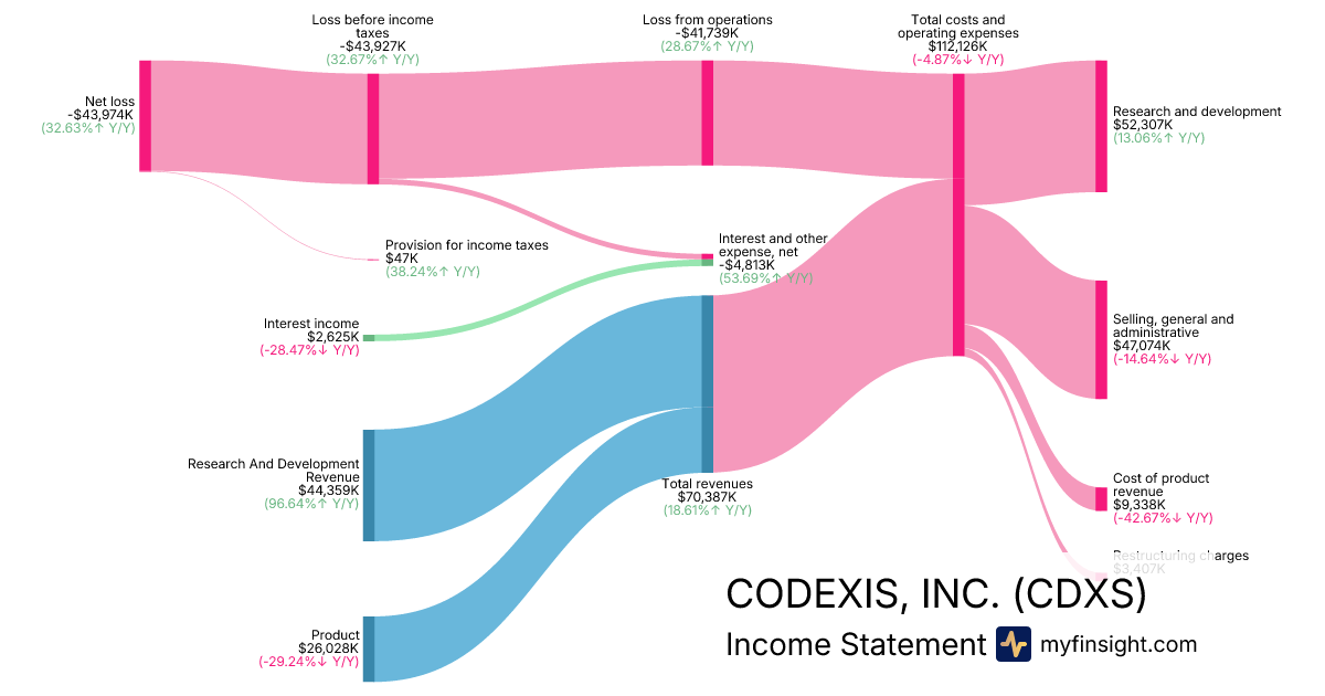 For the year ending 2025-12-31, CDXS made $70,387K in revenue. -$43,974K in net income. Net profit margin of -62.47%.