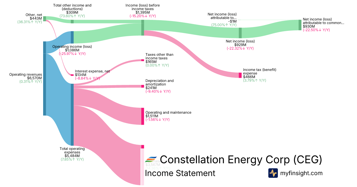 For the quarter ending 2025-09-30, CEG made $6,570M in revenue. $930M in net income. Net profit margin of 14.16%.