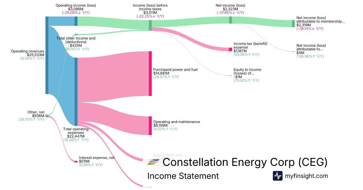 For the year ending 2025-12-31, CEG made $25,533M in revenue. $2,319M in net income. Net profit margin of 9.08%.