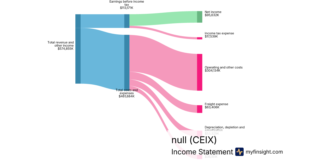 For the quarter ending 2024-09-30, CEIX made $574,855K in revenue. $95,632K in net income. Net profit margin of 16.64%.