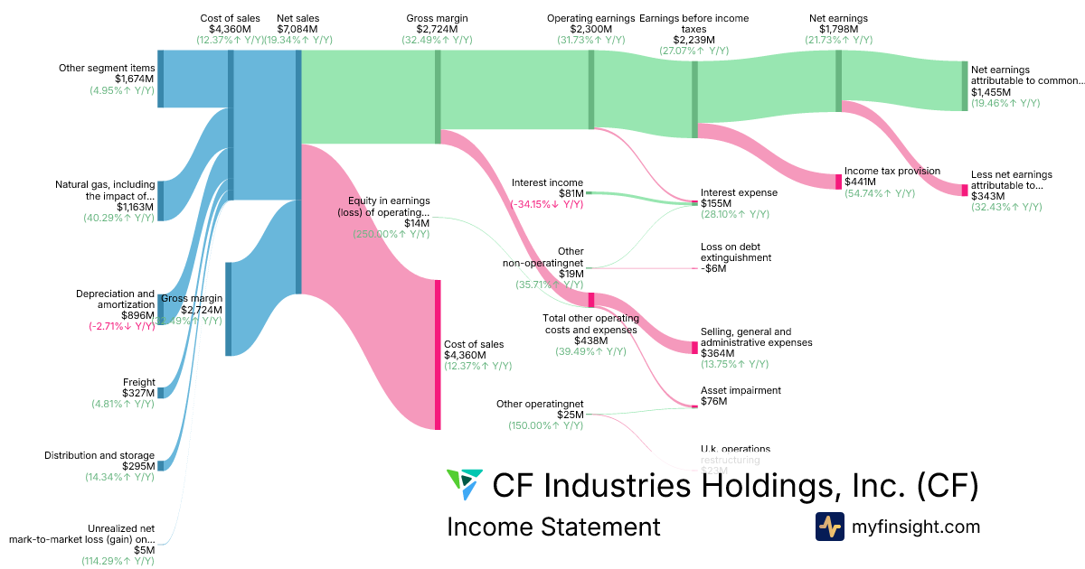 For the year ending 2025-12-31, CF made $7,084M in revenue. $1,455M in net income. Net profit margin of 20.54%.
