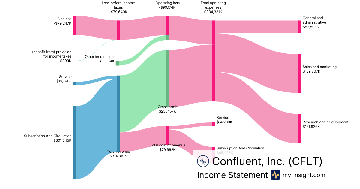 For the year ending 2025-12-31, CFLT made $1,166,748K in revenue. -$295,275K in net income. Net profit margin of -25.31%.