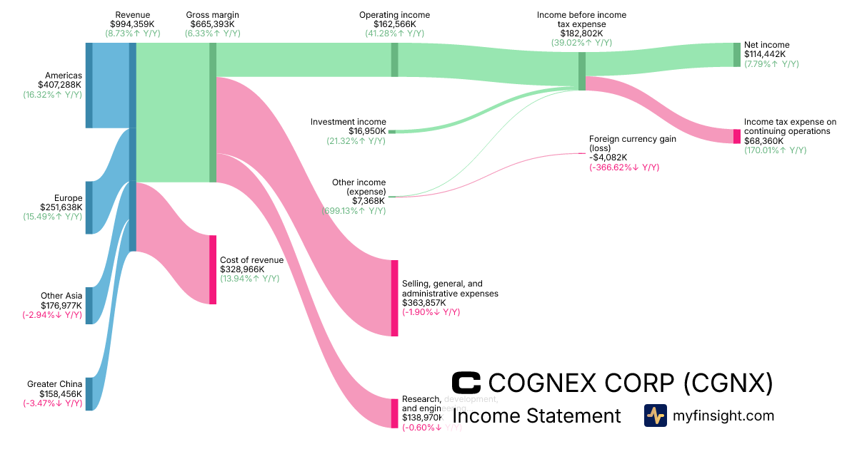 For the year ending 2025-12-31, CGNX made $994,359K in revenue. $114,442K in net income. Net profit margin of 11.51%.
