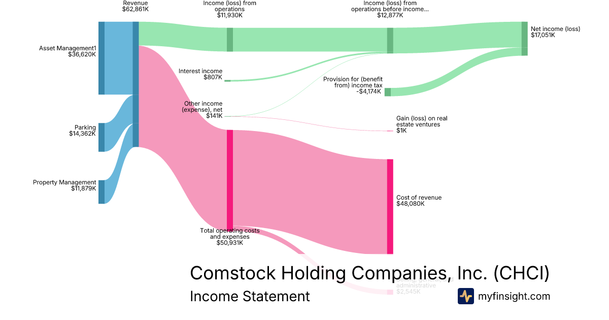 For the year ending 2025-12-31, CHCI made $62,861K in revenue. $17,051K in net income. Net profit margin of 27.12%.