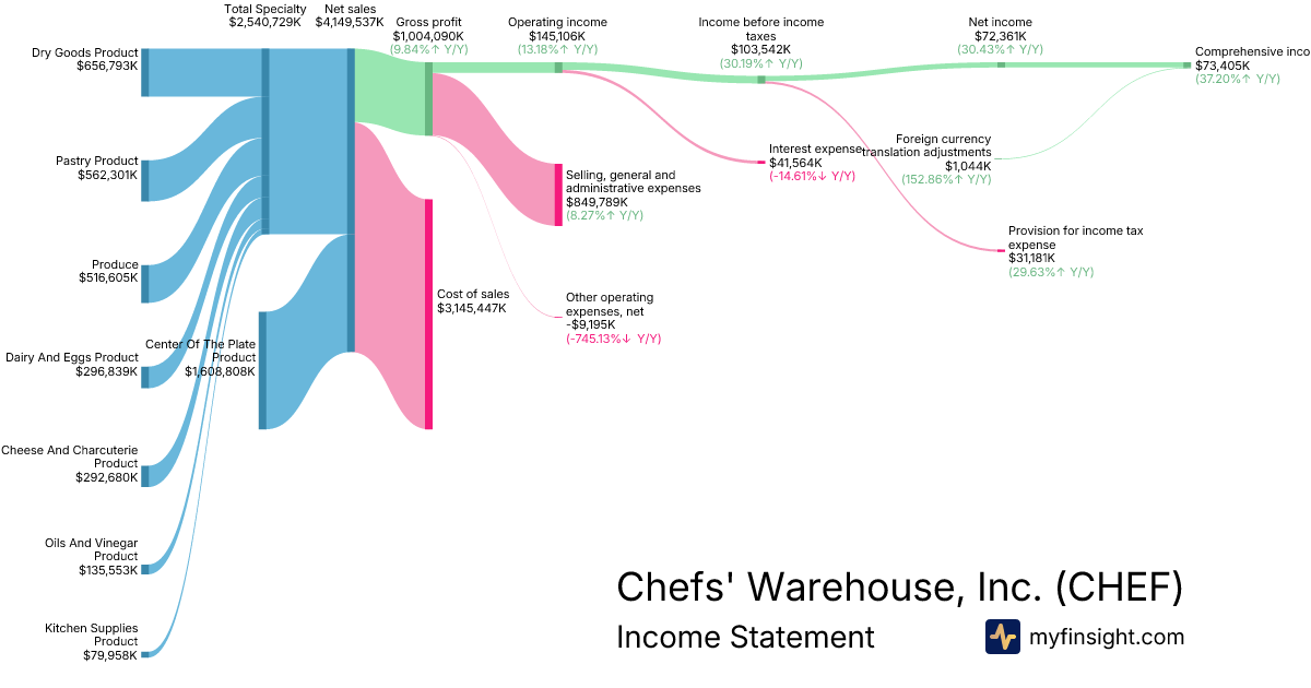 For the year ending 2025-12-26, CHEF made $4,149,537K in revenue. $73,405K in net income. Net profit margin of 1.77%.