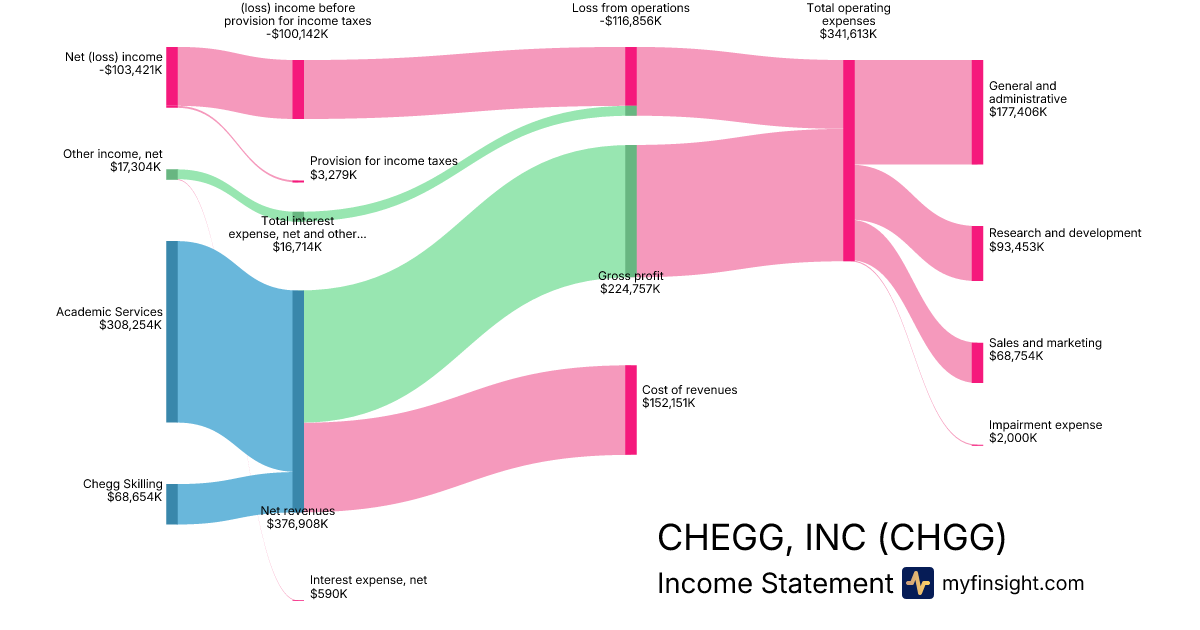 For the year ending 2025-12-31, CHGG made $376,908K in revenue. -$103,421K in net income. Net profit margin of -27.44%.