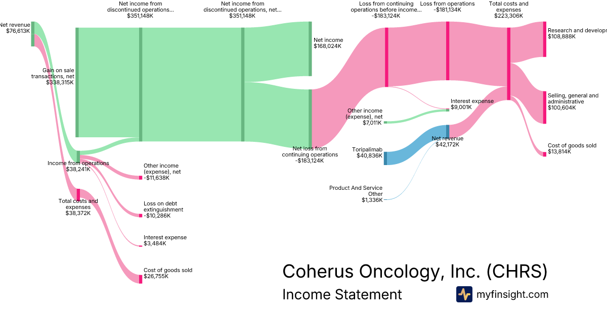 For the year ending 2025-12-31, CHRS made $42,172K in revenue. $168,024K in net income. Net profit margin of 398.43%.