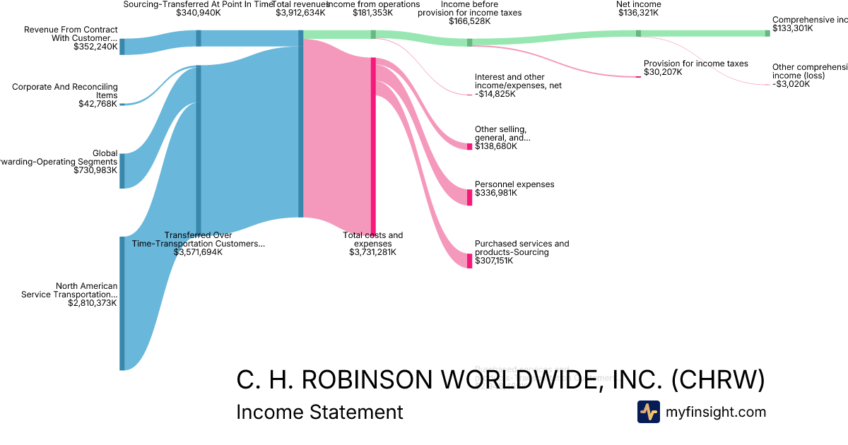 For the year ending 2025-12-31, CHRW made $16,232,763K in revenue. $619,809K in net income. Net profit margin of 3.82%.