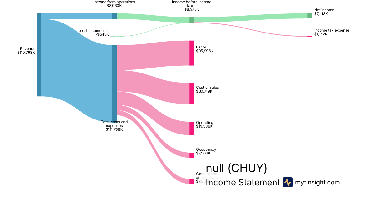 For the quarter ending 2024-06-30, CHUY made $119,798K in revenue. $7,413K in net income. Net profit margin of 6.19%.
