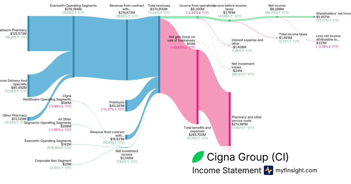 For the year ending 2025-12-31, CI made $274,900M in revenue. $5,957M in net income. Net profit margin of 2.17%.