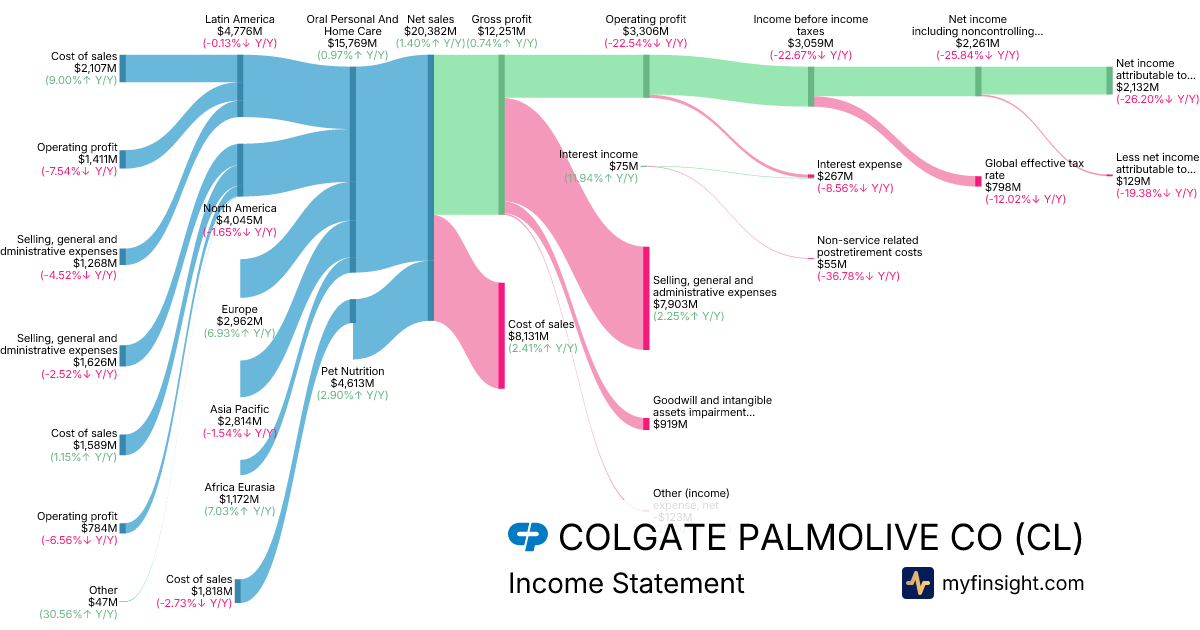 For the year ending 2025-12-31, CL made $20,382M in revenue. $2,132M in net income. Net profit margin of 10.46%.