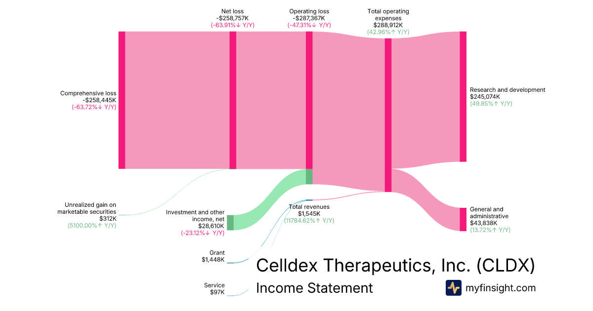 For the year ending 2025-12-31, CLDX made $1,545K in revenue. -$258,445K in net income. Net profit margin of -16727.83%.