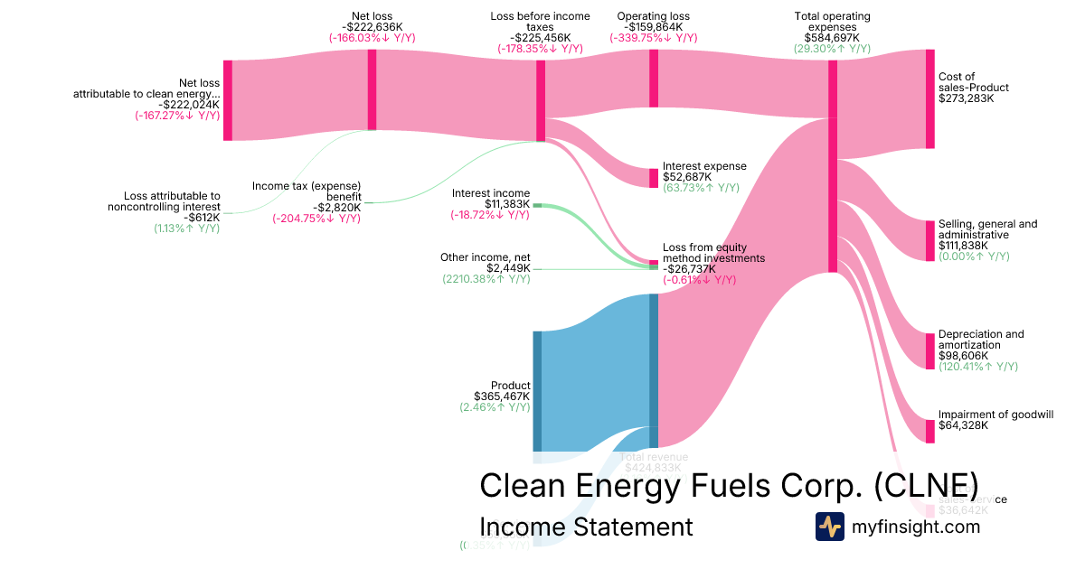 For the year ending 2025-12-31, CLNE made $424,833K in revenue. -$222,024K in net income. Net profit margin of -52.26%.
