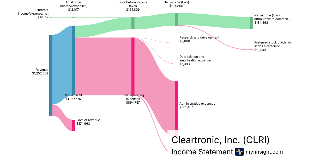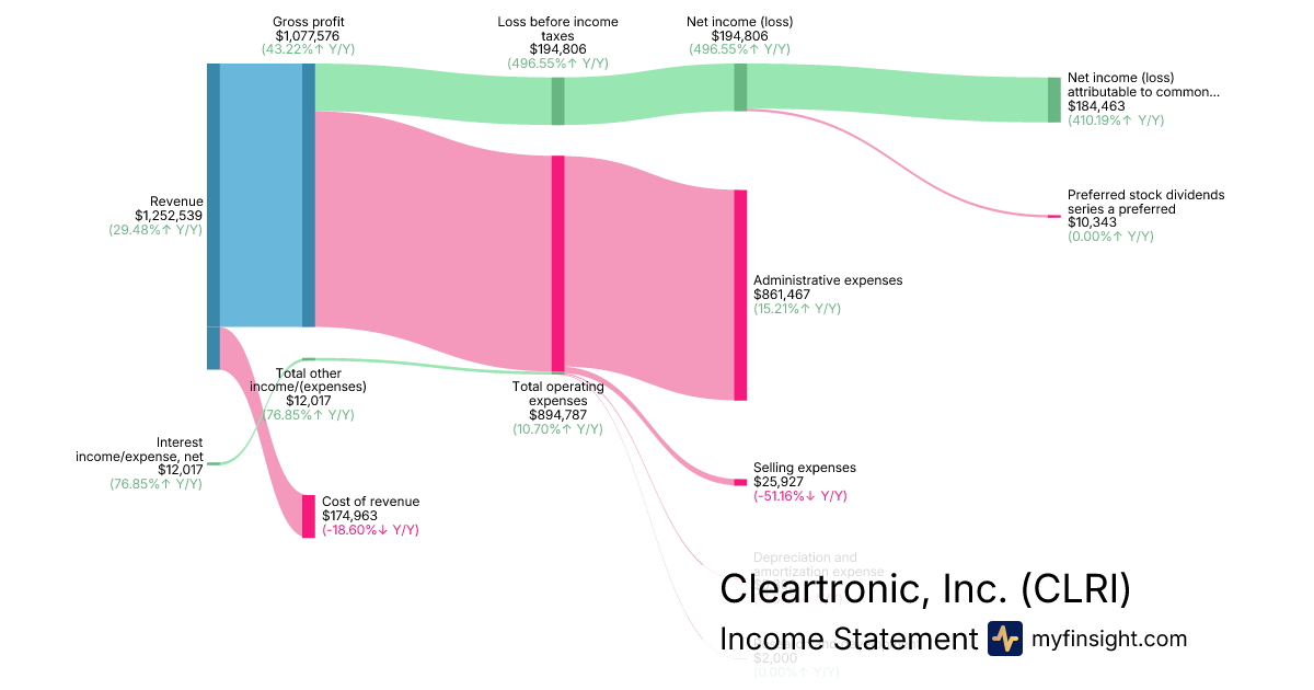 For the quarter ending 2025-12-31, CLRI made $1,252,539 in revenue. $184,463 in net income. Net profit margin of 14.73%.