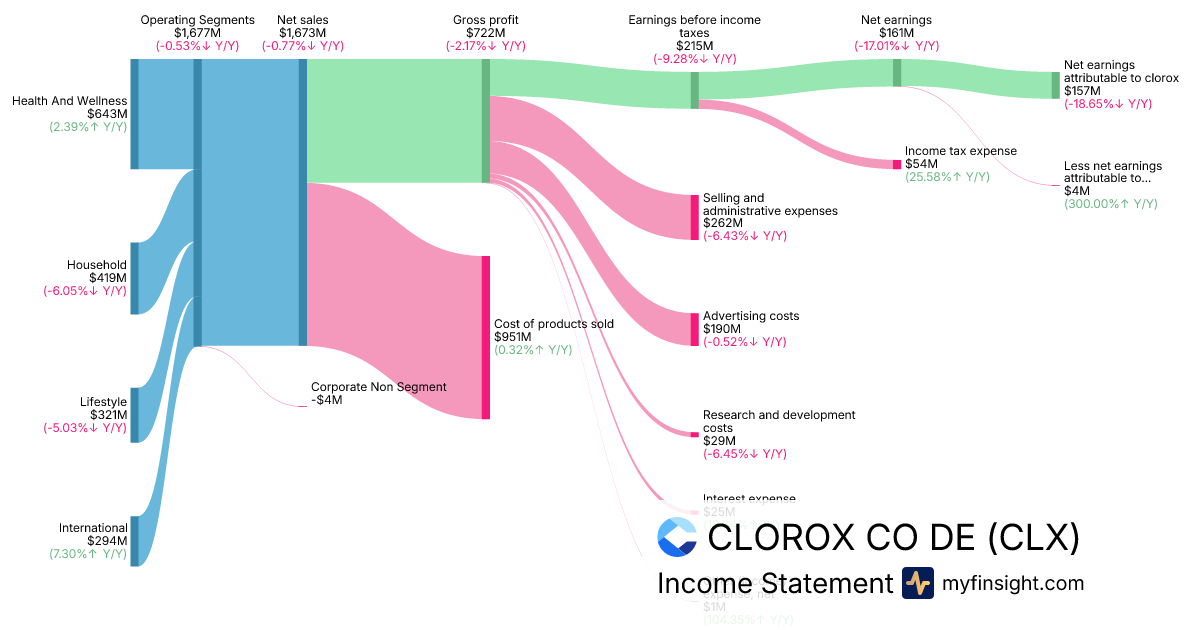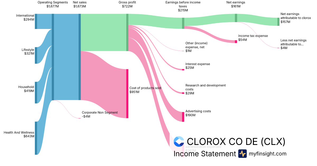 For the quarter ending 2025-12-31, CLX made $1,673M in revenue. $157M in net income. Net profit margin of 9.38%.