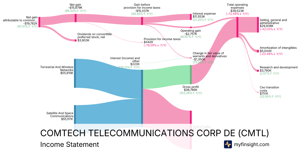 For the quarter ending 2025-10-31, CMTL made $111,032K in revenue. -$19,782K in net income. Net profit margin of -17.82%.