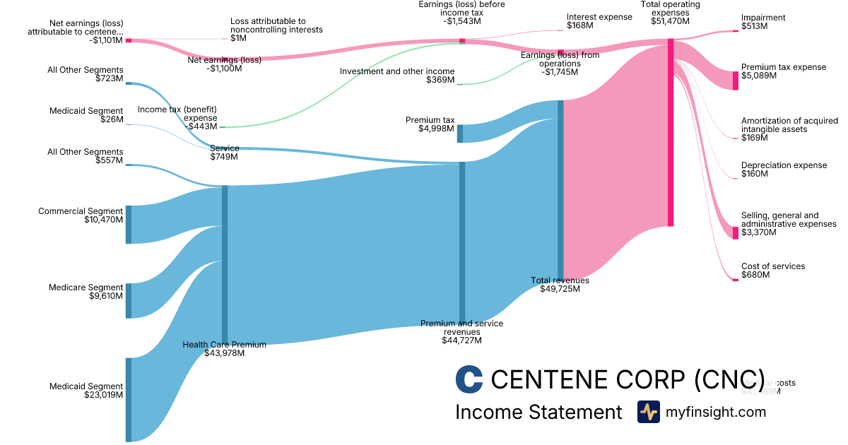For the year ending 2025-12-31, CNC made $194,777M in revenue. -$6,674M in net income. Net profit margin of -3.43%.