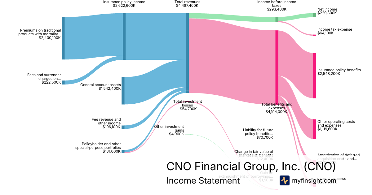 For the year ending 2025-12-31, CNO made $4,487,400K in revenue. $229,300K in net income. Net profit margin of 5.11%.