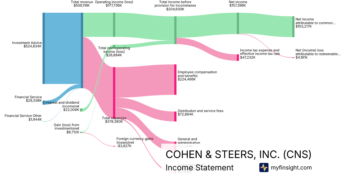 For the year ending 2025-12-31, CNS made $556,116K in revenue. $153,217K in net income. Net profit margin of 27.55%.