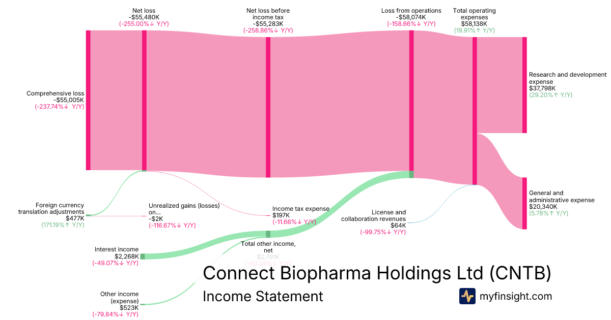 For the year ending 2025-12-31, CNTB made $64K in revenue. -$55,005K in net income. Net profit margin of -85945.31%.