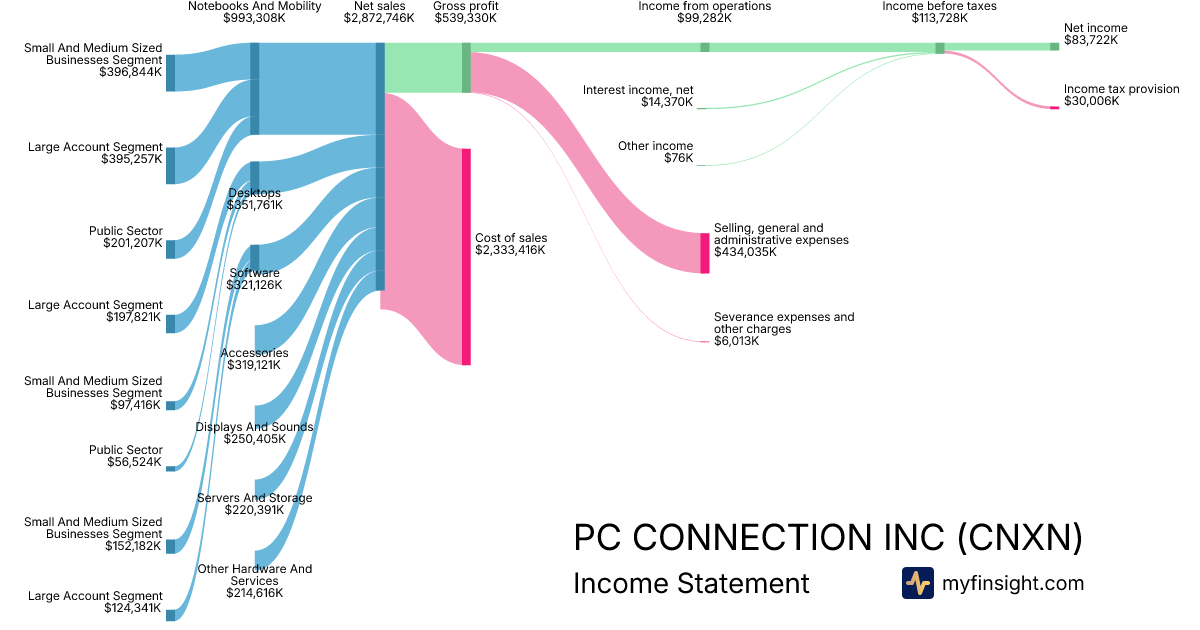 For the year ending 2025-12-31, CNXN made $2,872,746K in revenue. $83,722K in net income. Net profit margin of 2.91%.