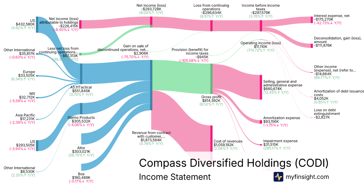 For the year ending 2025-12-31, CODI made $1,873,584K in revenue. -$226,415K in net income. Net profit margin of -12.08%.