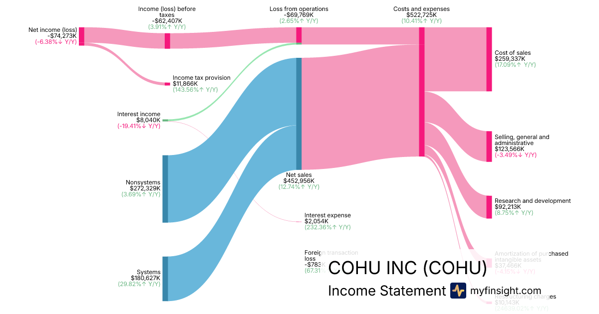 For the year ending 2025-12-27, COHU made $452,956K in revenue. -$74,273K in net income. Net profit margin of -16.40%.